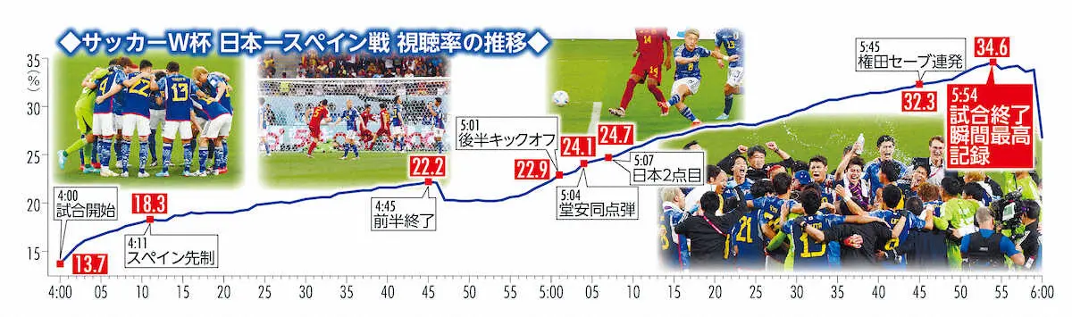 優勝候補スペインとの“早朝の一戦”は1次リーグ初戦のドイツ戦に続くジャイアントキリングながら、視聴率は対照的なカーブを描いた。寝ぼけ眼で観戦した人が大半のはずだが、グラフは右肩上がりで上昇し続けた。