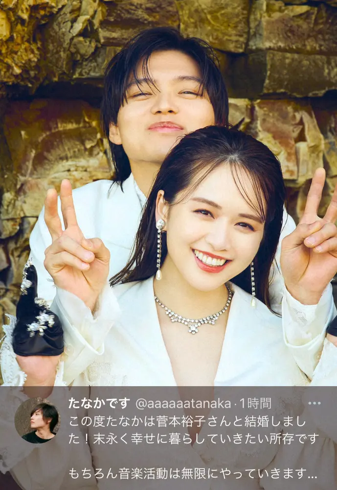 たなかは「私事で大変恐縮ではございますが、たなかは菅本裕子さんと入籍致しました」と報告。「菅本さんは一生を共にする伴侶として本当に素晴らしい女性であり、また同時に、もっとも尊敬できる人間のひとりでもあります。そんな方にプロポーズを受け入れてもらえたことは何より光栄で、とてつもなくよろこばしいことです」と記した。