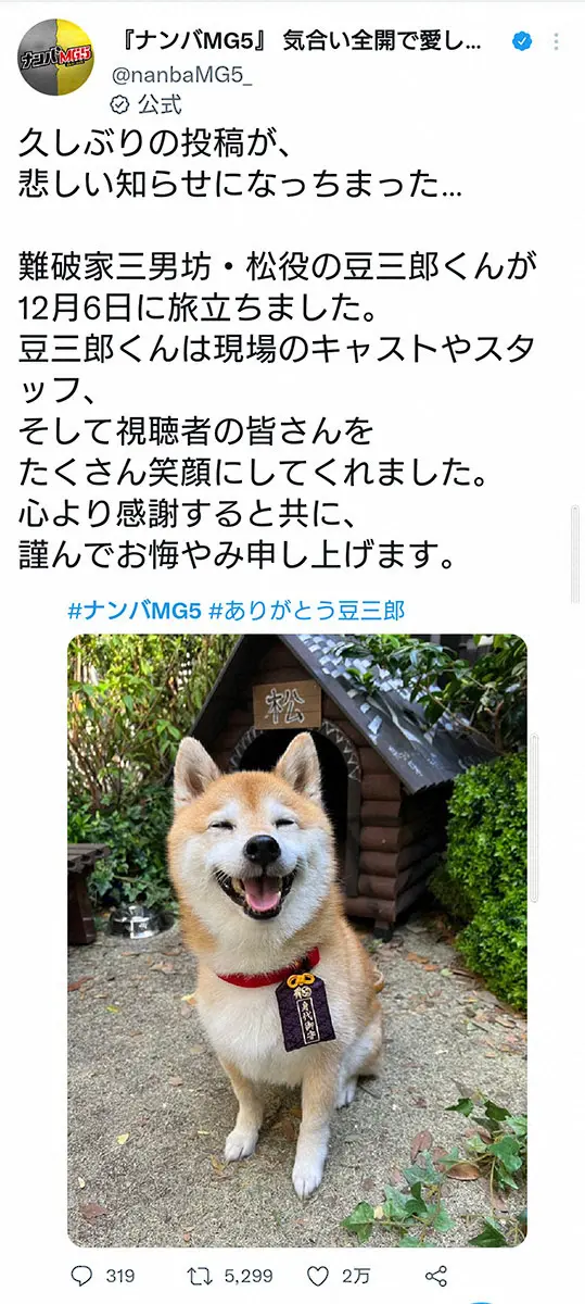 番組公式ツイッターが更新されるのは9月2日以来。その時は「我らが、松!こと…#津田健次郎さん&#豆三郎さんが#ザテレビジョンドラマアカデミー賞のザテレビジョン賞を受賞されました。おめでとうございます。渋い津田さんと可愛い豆のベストコンビでしたよね!!!」という内容だったが、この日は「久しぶりの投稿が、悲しい知らせになっちまった…難破家三男坊・松役の豆三郎くんが12月6日に旅立ちました。豆三郎くんは現場のキャストやスタッフ、そして視聴者の皆さんをたくさん笑顔にしてくれました。心より感謝すると共に、謹んでお悔やみ申し上げます」と悲しい報告となった。元気だった時の豆三郎くんの愛らしい写真も添えている。