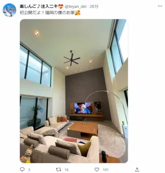 楽しんご公式ツイッター(@teyan_dei)から 楽しんご“福岡の豪邸”を公開 広すぎるリビング、カフェのようなテラスに… ギャラリーで見る この記事のフォト 2022年12月11日の画像一覧 もっと見る 2022年12月11日の画像をもっと見る