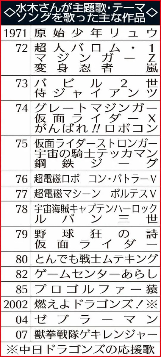 今年10月、「Anison Days」の番組収録を行い、Zポーズで決める水木一郎さん、森口博子 Photo by スポニチ アニソンの帝王・水木一郎さん逝く…肺がん闘病中の先月27日ライブ出演 も… ギャラリーで見る この記事のフォト 2022年12月13日の画像一覧 もっと見る 2022年12月13日の画像をもっと見る
