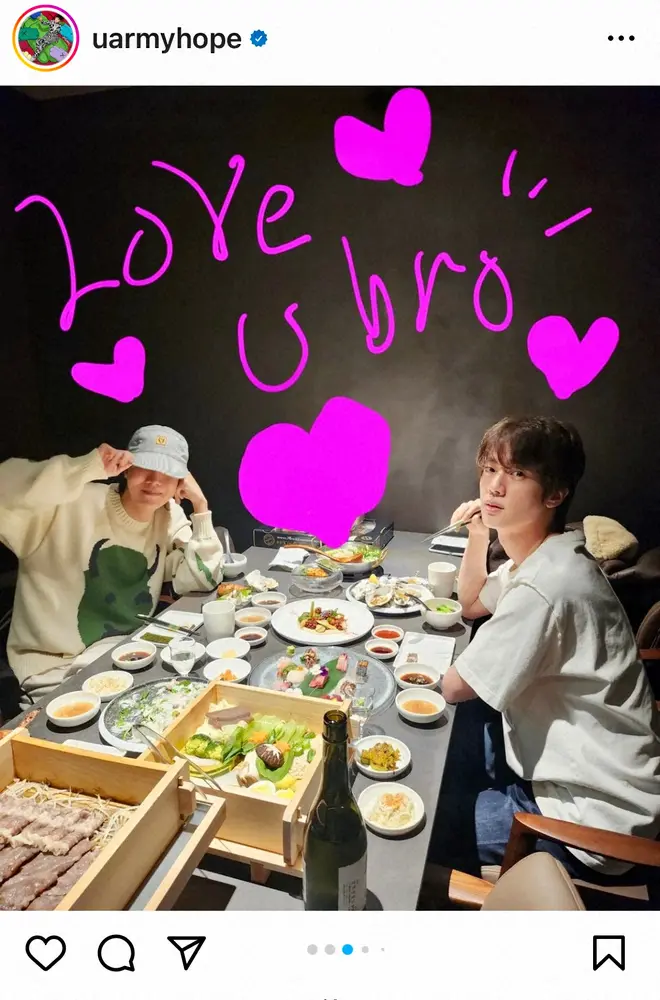 BTS・J-HOPEの公式インスタグラム(@uarmyhope)から BTS・J-HOPE「健康で幸せに 愛してるよ!!!」入隊したJINとの2ショット… ギャラリーで見る この記事のフォト 2022年12月13日の画像一覧 もっと見る 2022年12月13日の画像をもっと見る
