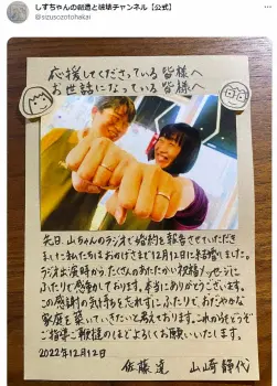 2人の結婚に、芸能界やファンからたくさんの祝福コメントが寄せられた。大きな反響に、しずちゃんは結婚指輪を強調したラブラブ2ショットを添えた直筆の手紙を投稿。「お世話になっている皆様へ 先日、山ちゃんのラジオで婚約を報告させていただきました私たちはおかげさまで12月12日に結婚しました」と入籍したことを報告し「この感謝の気持ちを忘れずにふたりで、おだやかな家庭を築いていきたい」とつづった。12日は大安で、物事を始めるのに良いとされる「一粒万倍日」だった。
