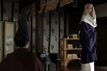 大河ドラマ「鎌倉殿の13人」第47話。政子(小池栄子・手前左)の“大演説”に耳を傾ける大江広元(栗原英雄・手前右)は…(C)NHK
