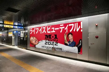 このポスタービジュアルをベースに、12月に入ると次々と広告を打ち出していきます。決戦が行われるテレビ朝日のお膝元・六本木駅には錦鯉さんへのインタビューを広告にした「王者インタビュー」と一昨年の決勝戦でインパクトを残したネタ「CRまさのり」のデジタルサイネージ広告を、長谷川雅紀さんの出身地である札幌市のJR札幌駅と東急渋谷駅には、昨年の決勝戦で披露したネタ「ライフイズビューティフル」の広告を、阪急・大阪梅田駅には長谷川さんの「こ~んに~ちは~」を使った「超ざっくりカウントダウン」広告を登場させました。