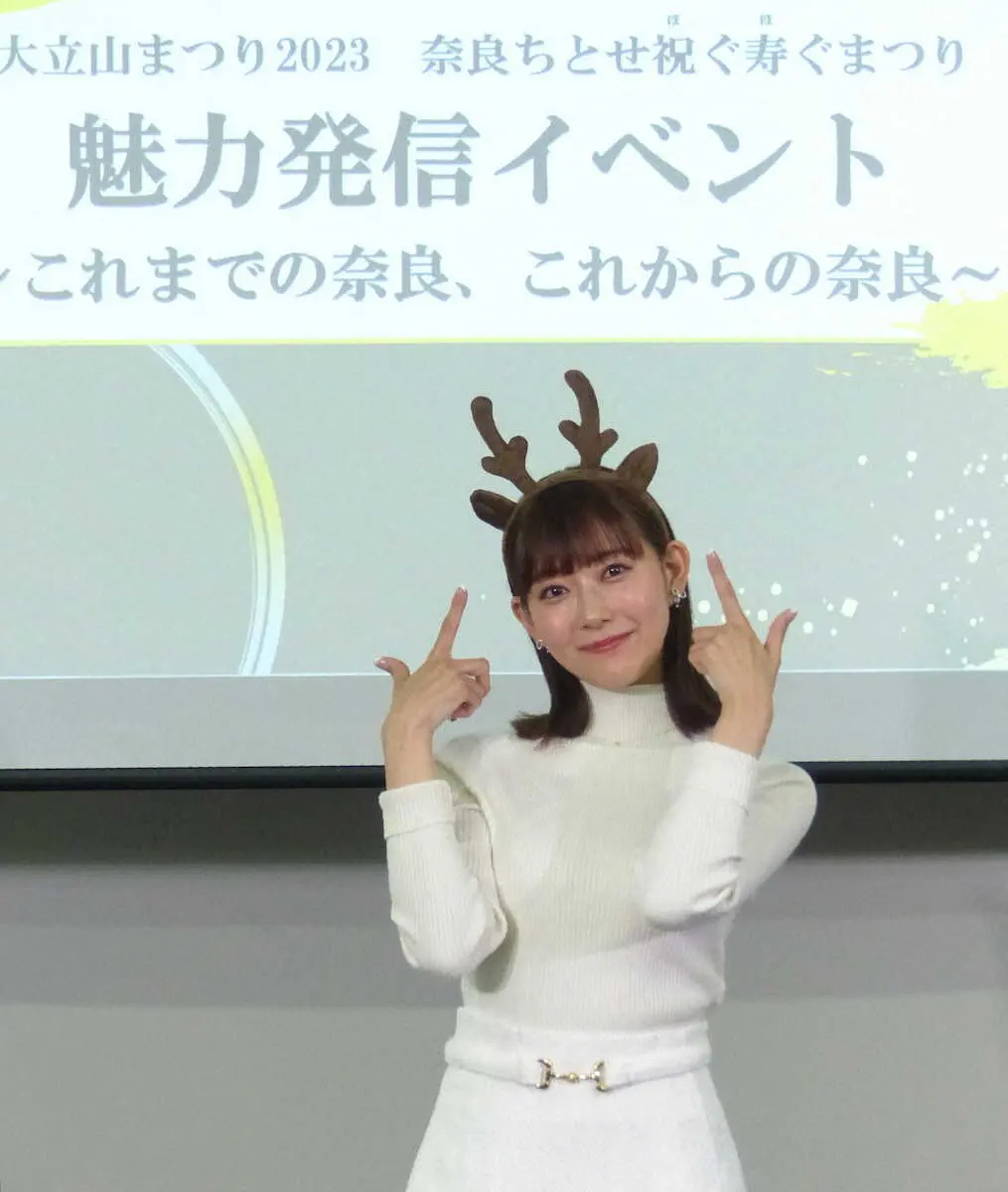 イベントでは「来てくれた方が口コミで広めたくなるようなお土産があるといいな」と、渡辺自ら奈良のお土産を提案。鹿の角がついたカチューシャを紹介し「奈良と言えば奈良漬けとか柿の葉寿司とか渋いもの。私は大好きなんですけど、若い世代の方はピンとこないのかなと思って、かわいらしいものはどうかなと思いました」とカチューシャ姿でアピールした。
