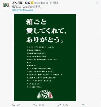 画像には「M-1グランプリのスポンサーとして、予選会場の楽屋に、どん兵衛を差し入れする。そんなどん兵衛からの愛を、あなたたちは毎年持ち帰ってくれましたね。箱ごと。準備が遅れて、差し入れが間に合わなかった時に、いただいたお叱りの言葉、忘れません。あなたたちは、最強にカッコいいM-1戦士でした。どん兵衛は、これからも応援し続けます。だから、バカみたいに、売れてくれ。そしてこれからは、ちゃんと買ってくれ。」とつづられ、ツイートには、お笑いコンビ「金属バット」の友保隼平のアカウントがメンションされた。