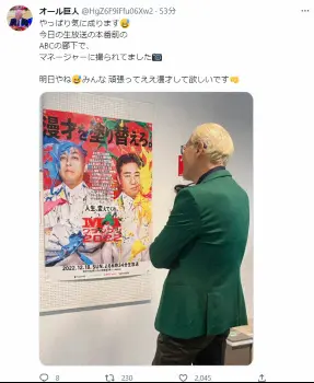 オール巨人は「やっぱり気に成ります」とつづり、『M―1グランプリ2022』のポスターを眺める写真をアップ。「今日の生放送の本番前のABCの廊下で、マネージャーに撮られてました」とツイートした。