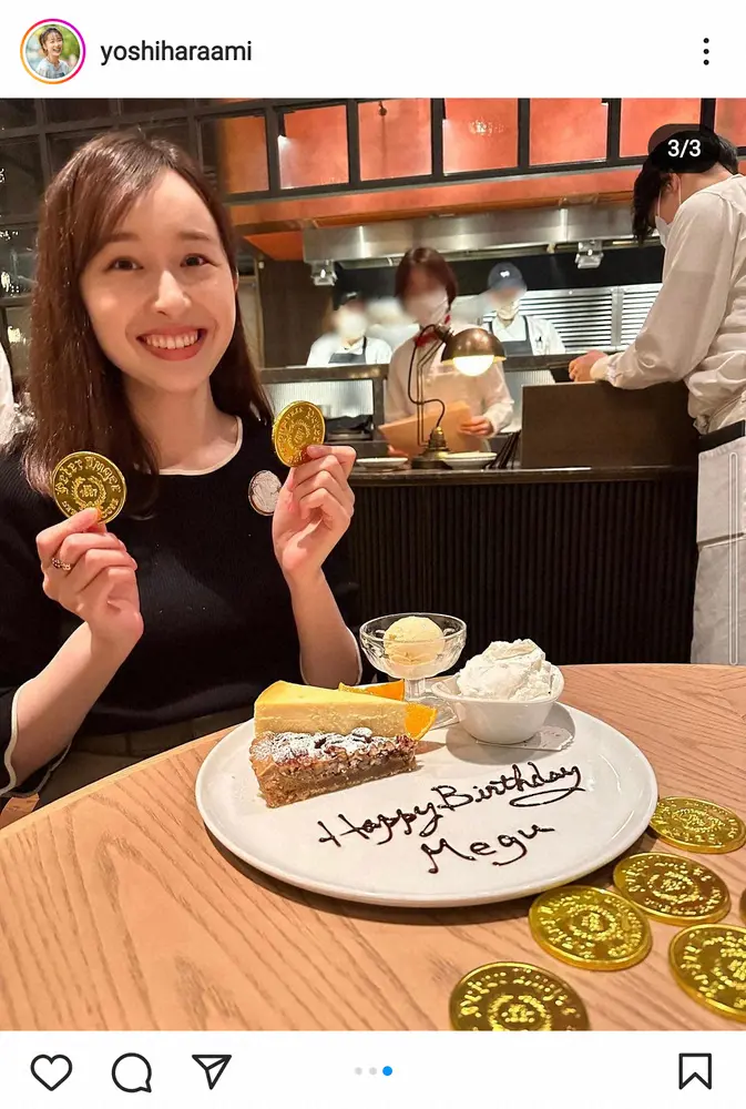 「同期で、メグのお誕生日おめでとうと、忘年会を」と記すと、バースデープレートを前にした黒のニット姿の宇賀神アナ、黒のトップス姿の田村アナ、紺色のトップス、スカート姿の自身の3ショットをアップ。「写真を撮っていたら、お店の方がコインチョコレートを沢山投げ込んでくださった 笑」と、コインチョコレートを手にした宇賀神アナのショットなども投稿した。ハッシュタグでは「いつもありがとう」「今年もありがとう」「来年もよろしくね」「同期ありがたや」「メグ金運アップの1年になりそうね」と添えた。
