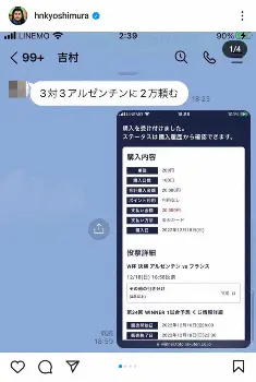 吉村は18日に行われたアルゼンチン対フランス戦の結果を予想。「3対3」に2万円を投じた。試合は3ー3でPK戦の結果アルゼンチンが4ー2で勝利を収めたものの、「WINNER」は90分終了時の結果(2―2)を予想するため、外れの結果に。