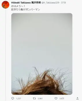 ジャニーズ事務所副社長を退任し、事務所を退社した滝沢秀明氏(40)が20日、自身のツイッターを更新。寝ぐせがついた髪形を公開し、反響を呼んでいる。