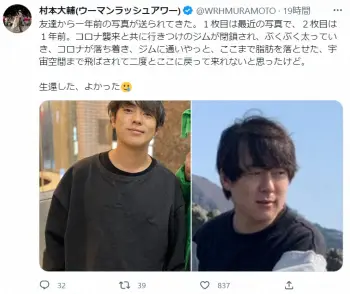 村本は「友達から一年前の写真が送られてきた」とつづり、1年前の自身の写真と、現在の姿をアップ。「1枚目は最近の写真で、2枚目は1年前。コロナ襲来と共に行きつけのジムが閉鎖され、ぶくぶく太っていき、コロナが落ち着き、ジムに通いやっと、ここまで脂肪を落とせた、宇宙空間まで飛ばされて二度とここに戻って来れないと思ったけど。生還した、よかった」と、ダイエットに成功したことを明かした。
