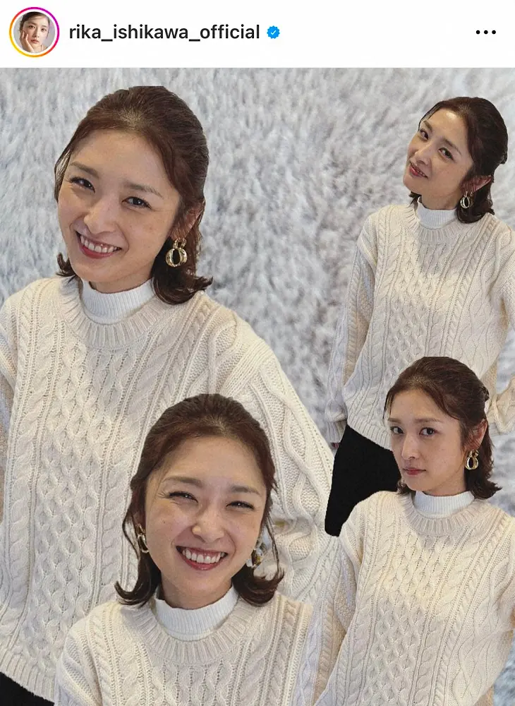 白のハイネックに白のセーターを合わせた「ホワイトコーデ」を披露した石川。だが、このコーデに決まるまで、野上氏から「何度もコーディネートをダメだしされ(パパに)」たという。