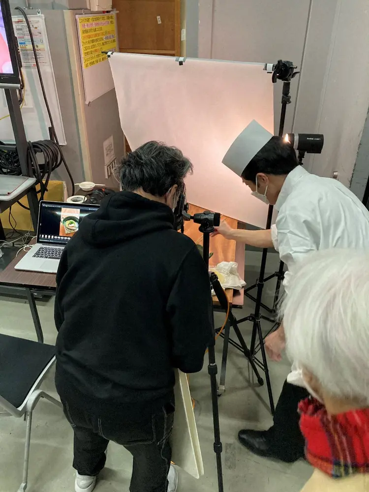 「どうしてこんな場所で撮影してるんですか?」。カメラマンさんに取材してみました。レシピ本は料理写真が命ですよね。できたてアツアツの湯気が立っているものを撮影しないと、美味しそうに見えないのだそう。また、少しでも乾燥するとツヤが無くなるし、特にカレーやシチューのようなものは、すぐに膜が張ってしまうんですって。だから、裏のキッチンのすぐ横で撮影していたんですね! ちなみにこの、裏で作った2食分のお料理は、最後にスタッフが全部美味しく頂いています。10本分収録しているので、ちょっとした立食パーティーのようです(笑)。