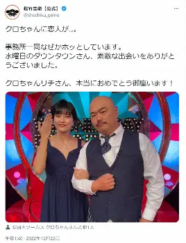 松竹芸能は「クロちゃんに恋人が...。」と切り出し、「事務所一同なぜかホッとしています」と吐露。クロちゃんとリチとの2ショットを添え、「水曜日のダウンタウンさん、素敵な出会いをありがとうございました。クロちゃんリチさん、本当におめでとう御座います!」と祝福した。