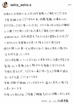 直筆の文書では「日頃よりお世話になっております皆様へご報告がございます。大変恐縮ではございますが私、佐藤聖羅は兼ねてよりお付き合いさせて頂いていた方と2022年2月22日(スーパー猫の日)に入籍させて頂いておりました事をご報告させて頂きます」と報告。