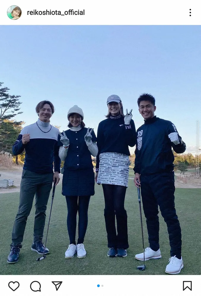 バドミントン元日本代表でタレントの潮田玲子(39)が22日、自身のインスタグラムを更新。プロゴルファーの石川遼(31=CASIO)、タレントの武井壮(49)、元バレーボール女子日本代表の狩野舞子さん(34)とのゴルフ場での4ショットを披露した。