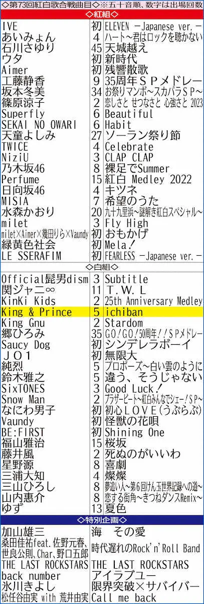 大みそかの「NHK紅白歌合戦」(後7・20)の出場歌手が歌う曲目が22日、同局から発表された。平野紫耀(25)岸優太(27)神宮寺勇太(25)が来年グループから脱退し、ジャニーズ事務所を退所することを発表しているKing&Princeは、6月に発売したアルバム「Made in」の曲「ichiban」に決まった。音楽関係者は「ジャニーズ事務所の出場者がシングルカットされていない曲を紅白で歌うのは極めて異例」と話した。
