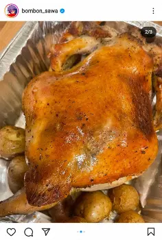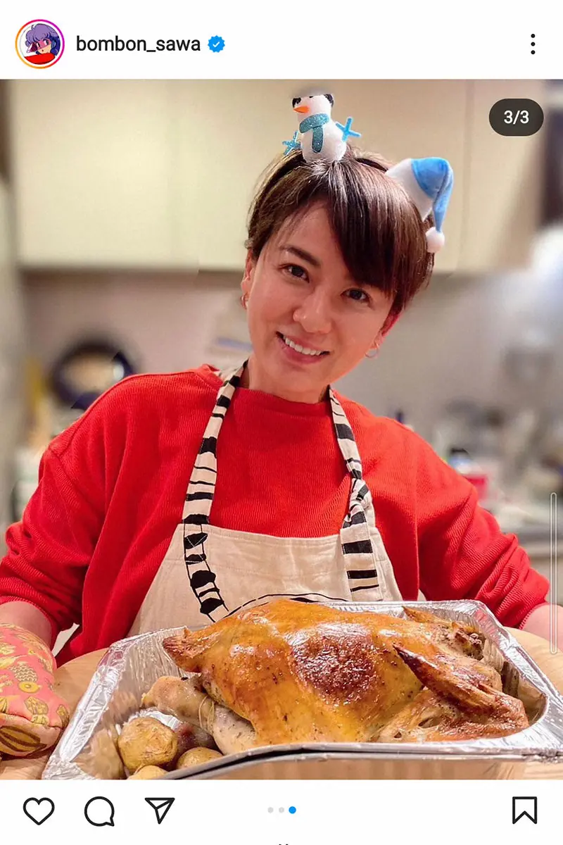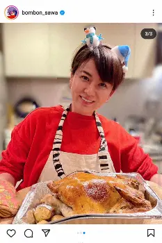 鈴木は頭に雪だるまなどの飾りをつけたカチューシャをして、おいしそうにこんがりと焼けたローストチキンを持つ写真や、サンタクロースのデコレーションをしたケーキの写真を投稿。「今年のケーキはフィラデルフィアクリームチーズのレシピを見てですね、その通り飾りも付けてみたんですがね。。お味はとてもおけまる 素朴な感じが手作りのいいところよね。。」と、今年のケーキは「サンタクロースレアチーズケーキ」にしたことを報告。