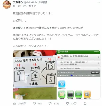 デカキンは「が、が、が、ガチで有馬記念の3連単当てました!!!974万円、、、運を使いすぎたので今後どんな不幸がくるかわかりませんが本当にイクイノックスさん、ボルドグフーシュさん、ジェラルディーナさんありがとうございました!!!みんなメリークリスマス!!!」と喜びをつづった。