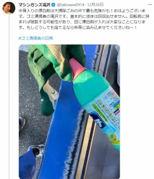 マシンガンズ滝沢ツイッター(@takizawa0914)から ゴミ清掃員芸人、年末のゴミに「最も危険なもの」が出され注意喚起 「こ… ギャラリーで見る この記事のフォト 2022年12月27日の画像一覧 もっと見る 2022年12月27日の画像をもっと見る