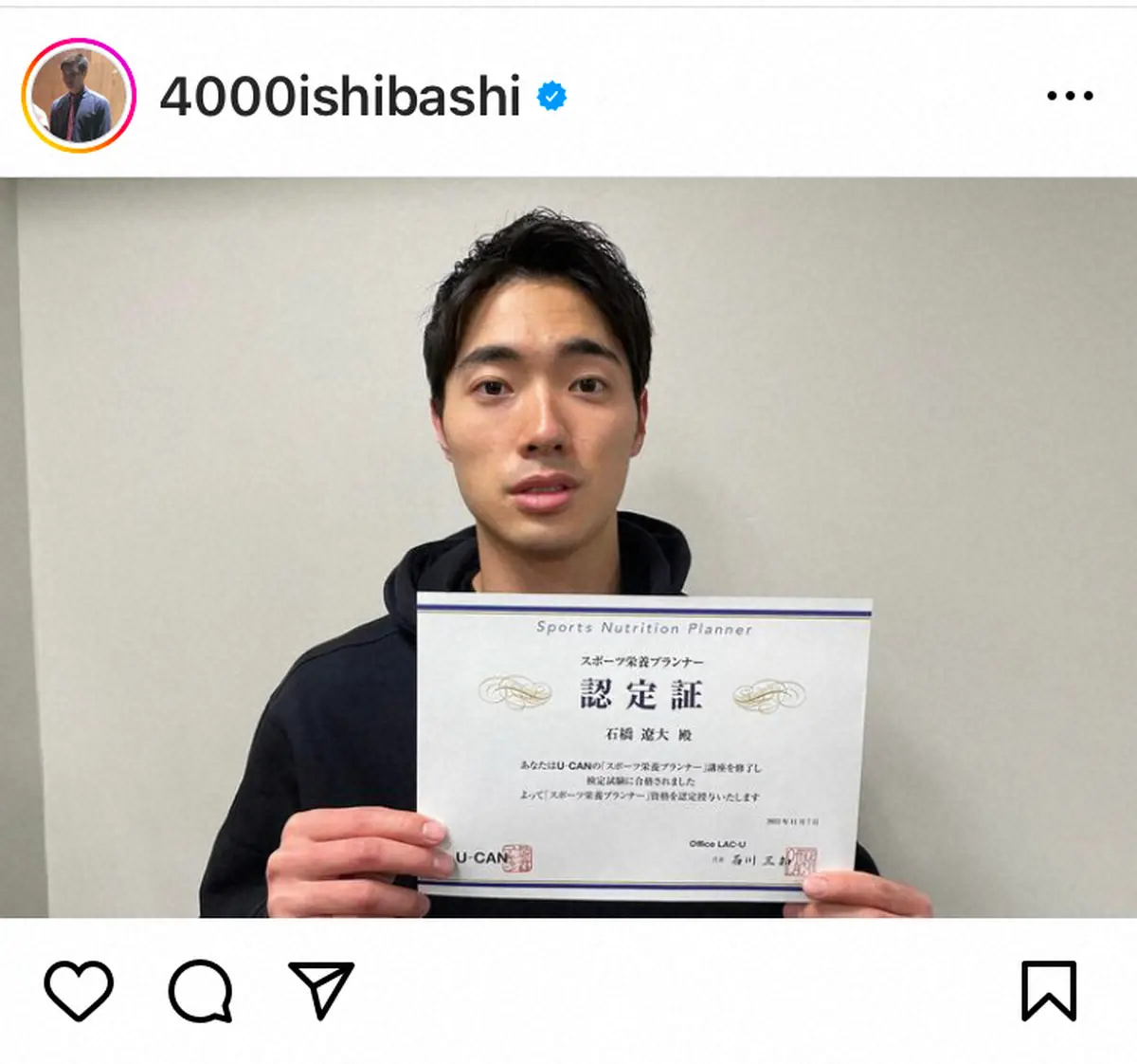 お笑いトリオ「四千頭身」の石橋遼大(26)が28日、自身のインスタグラムを更新。「スポーツ栄養プランナー」の資格習得を報告した。
