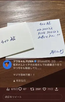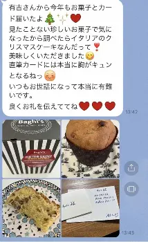 フワちゃんは「有吉さんとゥチのお母さんでお歳暮送り合うやつ今年も継続してた……マジで意味不明!!」とまさかの告白。母とのLINEのやり取りも添付しており、そこには「有吉さんから今年もお菓子とカード届いたよ 見たことない珍しいお菓子で気になったから調べたらイタリアのクリスマスケーキなんだって!美味しくいただきました 直筆カードには本当に胸がキュンとなるねっ いつもお世話になって本当に有難いです。良くお礼を伝えてね」と記されていた。