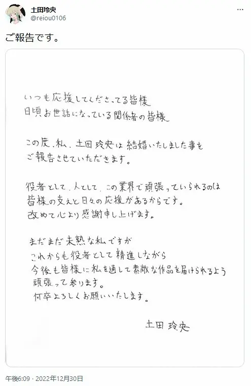 土田はツイッターに手書きの文章を投稿。「いつも応援してくださってる皆様 日頃お世話になっている皆様」と前置きし「この度、私、土田玲央は結婚いたしました事をご報告させていただきます。」と報告。「役者として、人として、この業界で頑張っていられるのは皆様の支えと日々の応援があるからです。改めて心より感謝申し上げます。」とファンへの感謝を述べた。