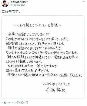 ツイッターとインスタグラムに直筆のメッセージをアップ。「いつも応援して下さっている皆様へ」とし、「私事で恐縮ではございますがこの度かねてよりお付き合いをさせて頂いている方と結婚致しましたことをご報告させて頂きます。まだまだ未熟ではありますがこれからの人生力を合わせ支え合いながらともに歩んで行けたらと思います。新たな経験とともに俳優としてより一層成長できる様にこれからも精進して参ります。なおお相手の方は一般の方ですので温かく見守って頂ければ幸いです。今後ともご指導ご鞭撻のほど何卒よろしくお願い致します。 2022年12月31日 平岡祐太」と記した。