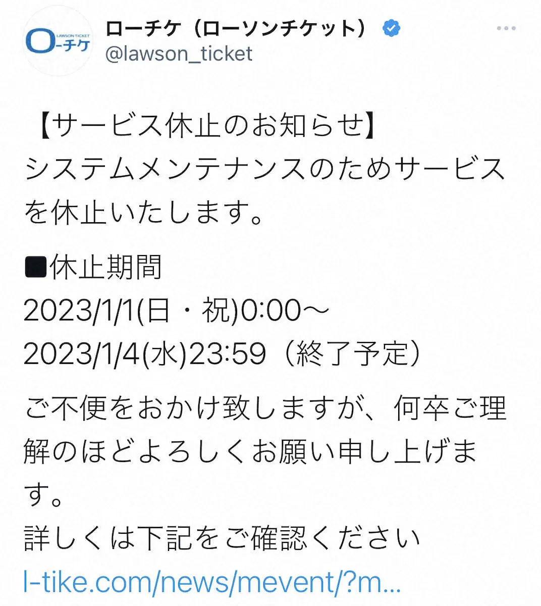 例えばローソンチケットでは、1月1日午前0時から1月4日午後11時59分までの休止を予定。チケット申し込みなどのインターネットサービス全般、チケット引き取りや代金支払いなどローソン、ミニストップ店内設置「Loppi」を利用したサービス全般を期間中、休止する。