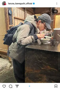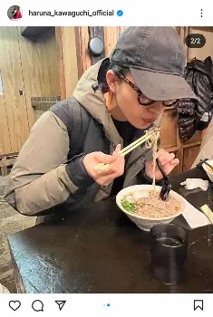 川口は「あけましておめでとうございます あけましておめでとうございます」とし「お正月っぽい、なんかキラキラしてる写真探したんやけどマジでないね。私のオフは映えない、、ということで先日人生初の立ち蕎麦の写真で。えもかったー!今年もうまいものいっぱい食べたいーー!!」と、帽子を被って眼鏡をかけ、蕎麦を食べる姿を披露した。