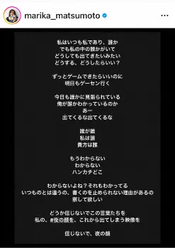 この日の投稿で「ドッキリ大成功!?…したかなぁ」と切り出した松本。「手の内を明かすべきか迷いましたがすべきと判断しました。この番組おける私の一言一句 一挙手一投足 すべて演技です。フェイクです」と番組内での役柄に言及。続けて「多重人格役に呑み込まれていく憑依型女優ってこんな感じかしらと演ってみただけです」と告白した。
