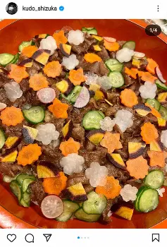 工藤は「お友達とワイワイ食べるのに良さそうな『肉チラシ寿司』」として、様々な形に切られた野菜がちりばめられた色とりどりの美しいチラシ寿司の写真を投稿し「白米は昆布を入れて炊き酢飯に。きゅうりと人参は酢漬けに、カブやカラー人参は出汁に付けて、大根は甘い酢に!そしてお肉はニンニク生姜甘辛です」と説明。また、添えてあるレタスには「ごま油 塩 醤油はほんの香り付け すりごま 酢 韓国海苔」で味をつけているとした。