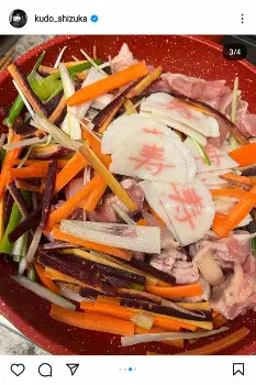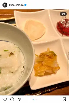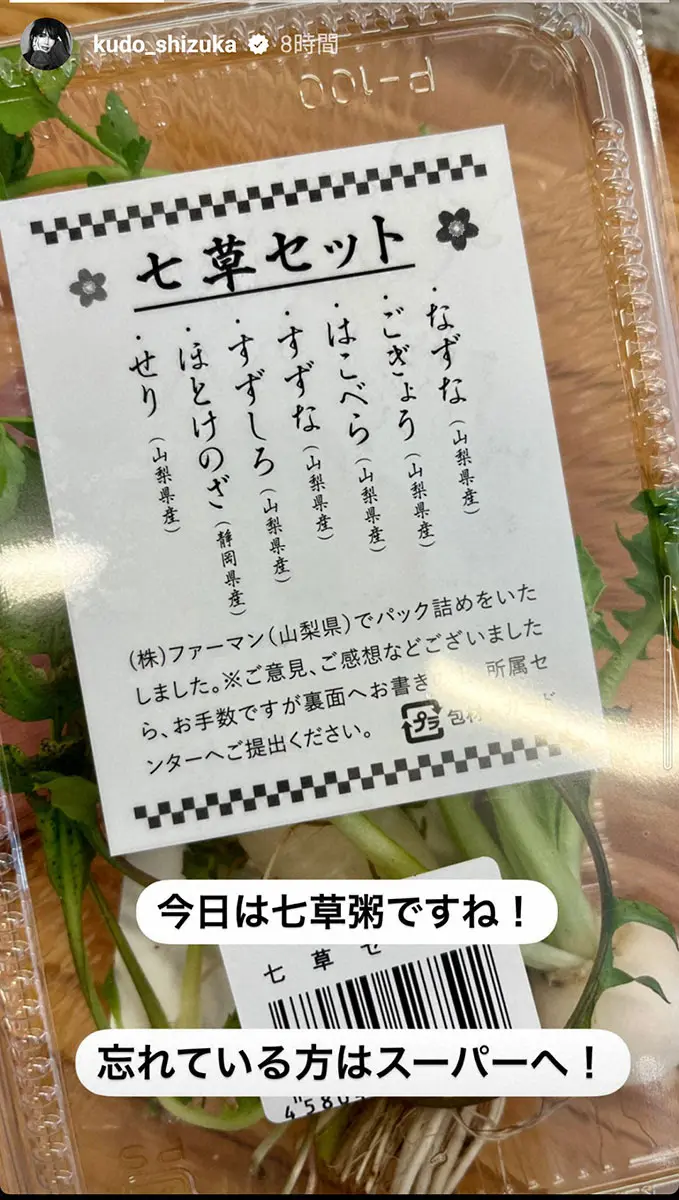 この日は「七草粥」を食べる「人日の節句」。工藤は七草粥セットを使って作った粥の写真を投稿。「七草粥は召し上がりましたか? 私は玄米一合、白米一合、を別々に炊きました そしてお正月の残り野菜と鶏肉を足して昆布たっぷり一品 1年の無病息災を願いましょう」とつづった。