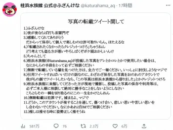 桂浜水族館が投稿する写真の使用については「必ずご相談ください」と呼びかけた上、来館者が撮影し、SNSで投稿した写真についても「必ずご本人様に相談して勝手なことをしないようにしなさい こちとらその一瞬を切り取るのにこの一生をかけとんねん」とつづった。