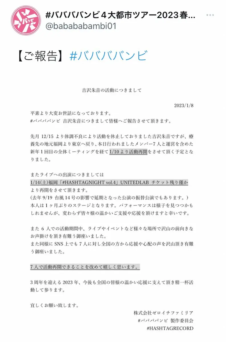 女性7人組アイドルグループ#ババババンビの吉沢朱音(25)が、8日にグループのツイッター公式アカウントで活動再開を発表した。