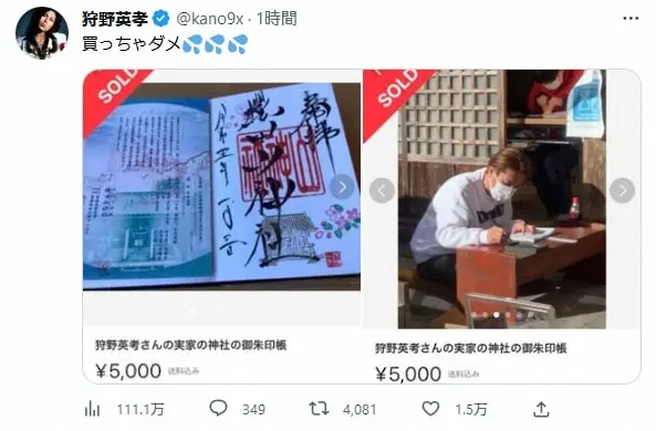 狩野英孝 Photo by スポニチ 狩野英孝「買っちゃダメ…ショック」実家神社の御朱印がフリマサイトで“高… ギャラリーで見る この記事のフォト 2023年01月09日の画像一覧 もっと見る 2023年01月09日の画像をもっと見る