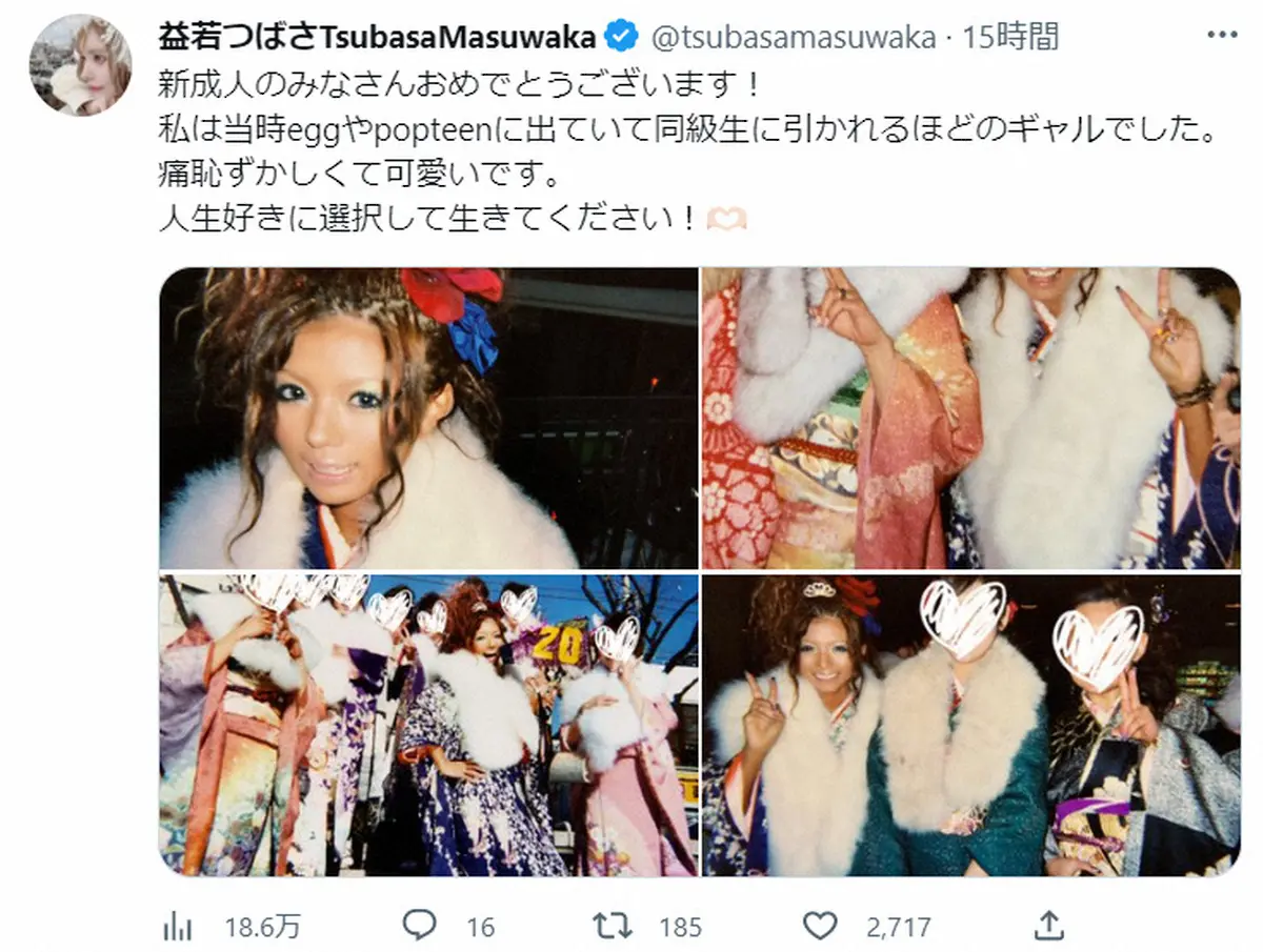 タレントでモデルの益若つばさ Photo by スポニチ 益若つばさ 黒ギャル時代の振袖姿公開で「人生好きに選択して生きて」と… ギャラリーで見る この記事のフォト 2023年01月10日の画像一覧 もっと見る 2023年01月10日の画像をもっと見る