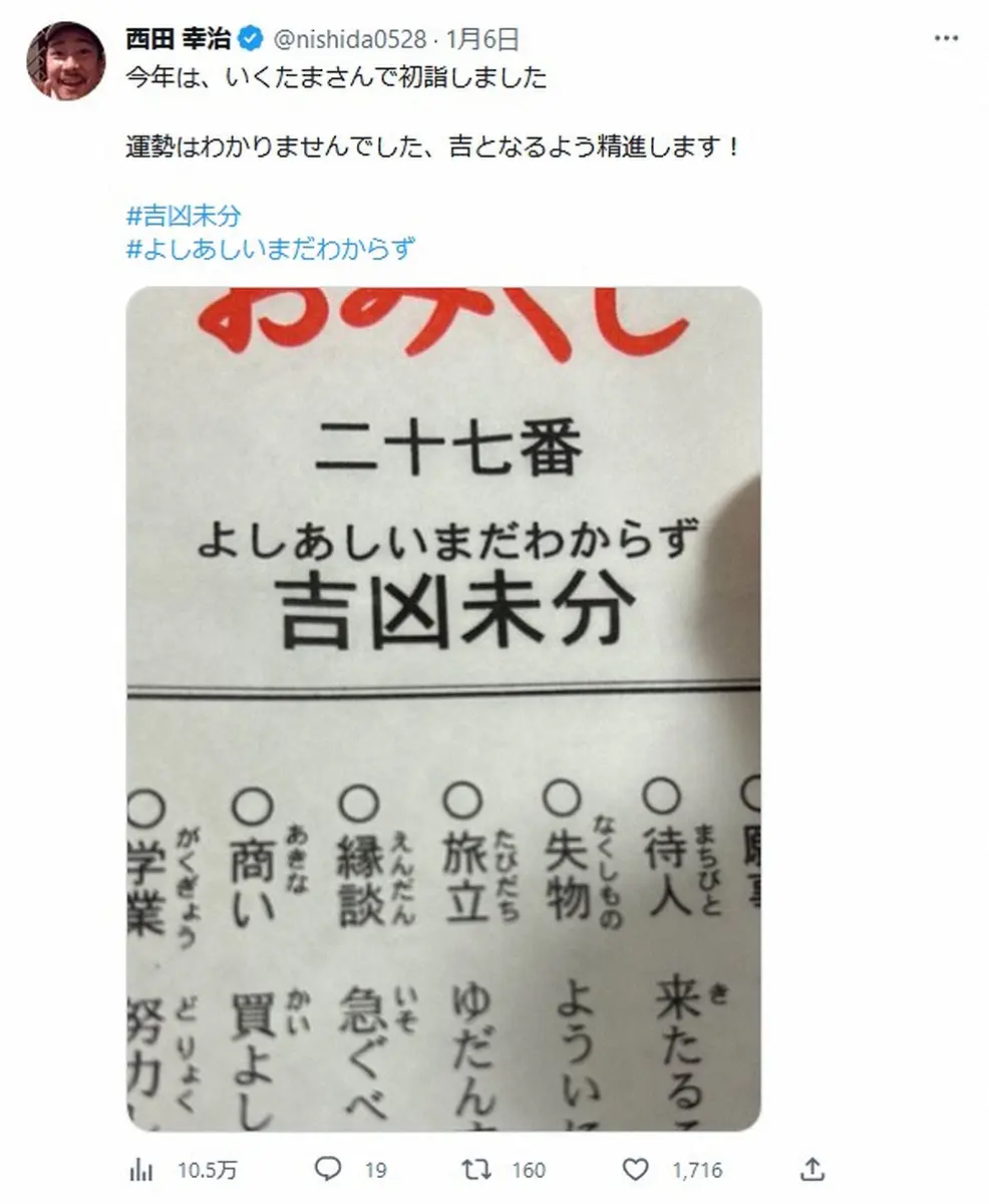 「笑い飯」の西田幸治 Photo by スポニチ 笑い飯・西田「おみくじで、あんまり知らんやつ出まして」 小籔爆笑後、… ギャラリーで見る この記事のフォト 2023年01月10日の画像一覧 もっと見る 2023年01月10日の画像をもっと見る