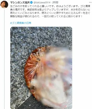 日頃からごみにまつわる豆知識などを、SNSで発信している滝沢。この日は「生ごみの汁を絞ってくれると嬉しいです」と、水分が多く残った生ゴミがまとめられたゴミ袋の写真を投稿。「おはようございます。ゴミ清掃員の滝沢です。焼却技術は昔よりアップしていますが、水分を切らないと燃えにくいごみとなります」とし「燃えにくいと燃やすためにエネルギーを注ぐ無駄な税金が使われるので、一回だけ絞ってくれると助かります!」と注意点を記した。