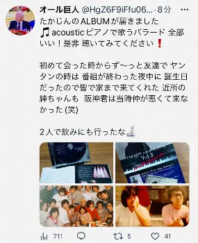 続けて「初めて会った時からず~っと友達でヤンタンの時は番組が終わった夜中に誕生日だったので皆で家まで来てくれた 近所の紳ちゃんも 阪神君は当時仲が悪くて来なかった(笑)2人で飲みにも行ったな」と島田紳助さんらと大勢で飲み会を行う写真の他、やしきたかじんさんと2人で石段に座り、カメラに納まる懐かしい写真を公開した。