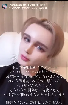 Mattは細胞再生医療の点滴をしているとし、すっぴんの動画に「幹細胞のおかげなのか28歳には見えない気がする。年相応に思われたことがない」とコメント。また、「逆に化粧濃い時に38歳?と言われたことある。ありえない。その人のことは許しませんwうそ」と茶目っ気たっぷりにつづった。