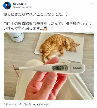 松丸は前日、「寝て起きたらヤバいことになってた、、」と40.2度の温度計の写真をアップ。「コロナの検査結果は陰性だったんで、引き続きいっぱい休んで早く治します…」と明かしていた。