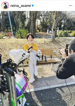 浅見は「産後初の撮影」とつづり、公園と思われる場所でダウンコートを着た姿をアップ。黄色のトップスに白のパンツ姿で犬と一緒にベンチに座るショットとともに「仕事復帰です おなじみのメンバーでホッとしました」と記した。