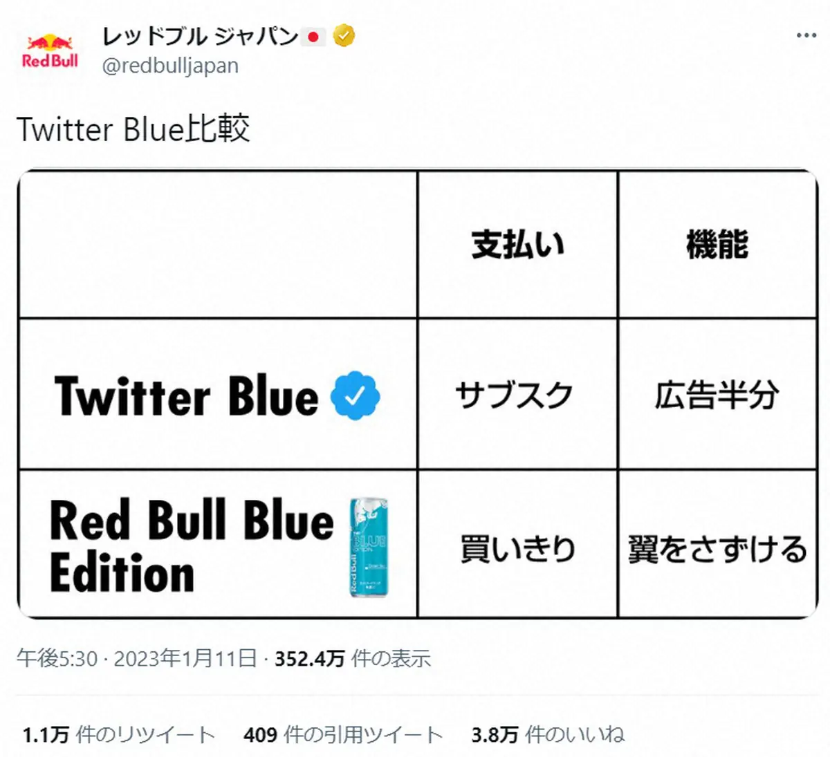 エナジードリンク「レッドブル」で知られるレッドブル・ジャパンが12日、公式ツイッターを更新。ツイッターのサブスクリプションサービス「Twitter Blue」が開始したことに合わせてジョークを投稿し、話題になっている。
