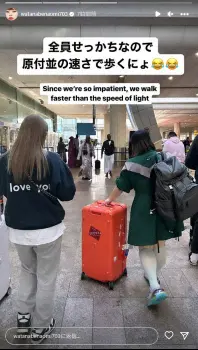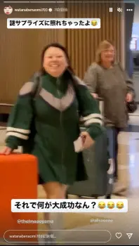 「ドバイ空港についたら、先に到着した2人がふざけて待ってたwww」と青山と植野が「NAOMI WATANABE」と描いた手作りのウェルカムボードを持って大爆笑しながら熱烈歓迎。「どうもすみません、わざわざ…」と照れながら空港の到着ロビーを歩く自身の動画をアップし、「謎サプライズに照れちゃったよ」と添えた。