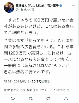 青汁王子は「月収100万円」「無断欠勤を許す」など自身の雇用条件を提示し、大ヒンシュクを買っているへずまりゅうの投稿について言及。「100万円で雇いたい会社があるらしいけど、これはある意味で合理的」とつづり「企業はまず『知ってもらう』ことに年間で多額の広告費をかける。これを年間1200万円で実現し、これだけニュースになるなら広告費としては割安。悪名は無名に勝るんです」とへずまりゅうを擁護するコメントを残した。さらに「きっと『年間1200万円払って悪いイメージをつけるのはマイナス』という意見が来ると思いますが、人はすぐ忘れる。話題になれば、最後には認知だけが残る。極端な話が逮捕されてニュースになった人がインフルエンサーとしてバリバリ復活できるのがこの理屈です」と自身の経験も踏まえた持論を展開した。