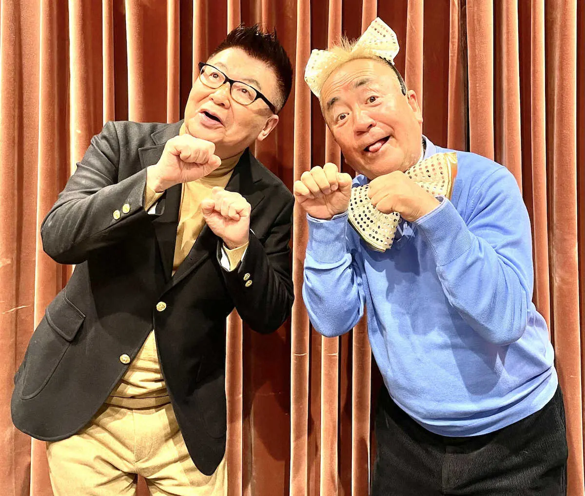 田淵幸一さんから「漫画だな」と娘の結婚の祝福を受けたせんだみつお(右)と生島ヒロシ