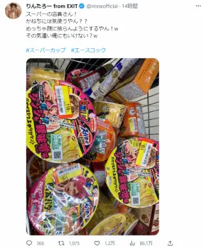 りんたろー。は「スーパーの店員さん!」と呼びかけ「かねちには気使うやん??めっちゃ顔に被らんようにするやん!wその気遣い俺にもいけない?w」とツイート。EXITが監修したカップ麺の商品がスーパーで販売されている様子を公開し、割引シールの貼り方にツッコミを入れた。