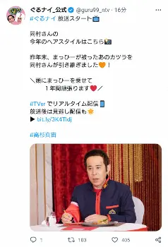 高杉への思いが乗った髪形に、番組公式ツイッターは「カツラ見たらまっひー驚くだろーなー!」とツイート。「高杉さんが付けた時に来年はアレにしようと岡村さん決めてたようです」と、裏事情を明かしていた。